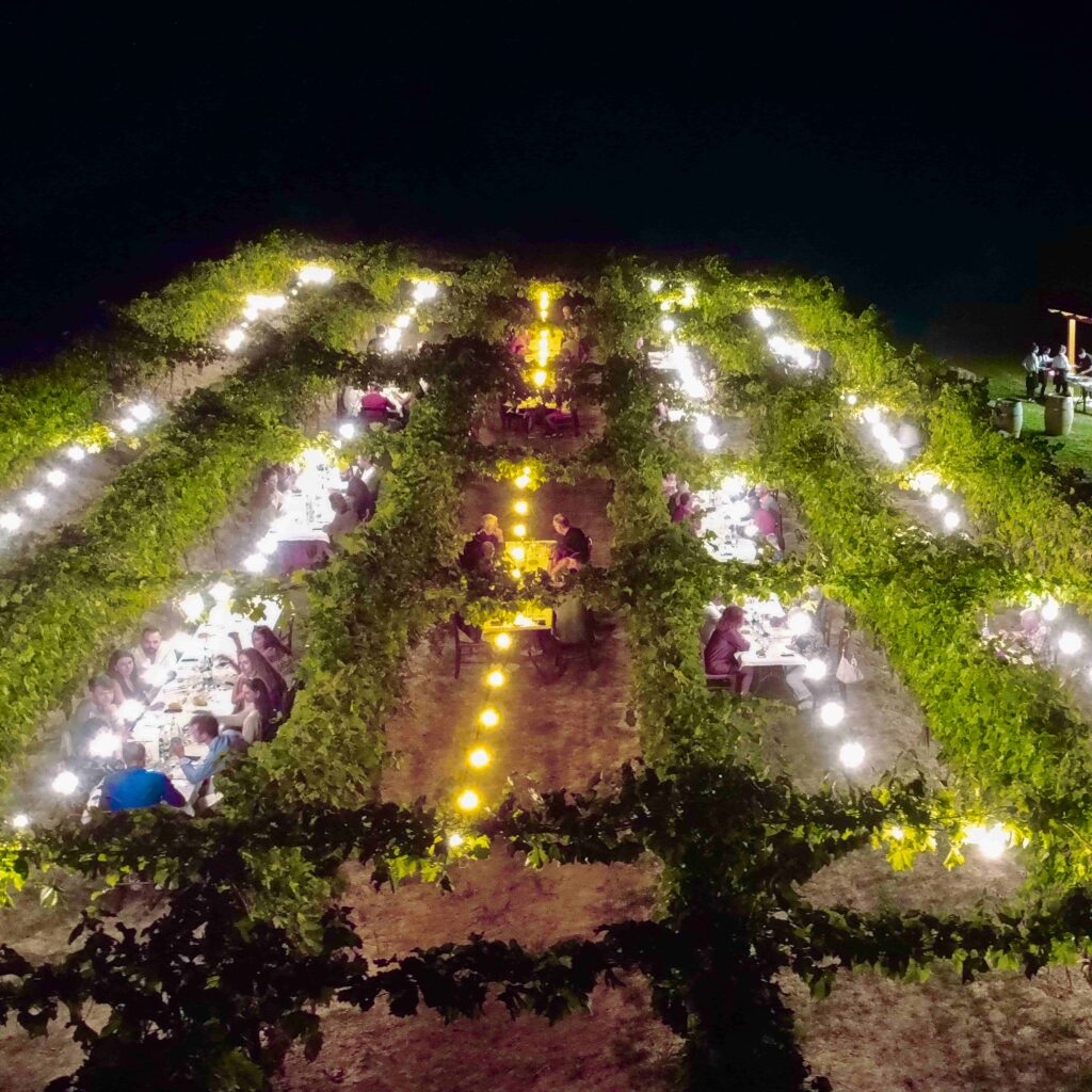 Le cene in vigna sono eventi organizzati dall’agriturismo con date prefissate. Da giugno a settembre, l’agriturismo da la possibilità di cenare all’interno dei filari del proprio vigneto. L’evento inizia alle 19.30 con un aperitivo al tramonto per poi passare all’interno della vigna al calar della notte. Il menù è fisso e cambia ogni volta. Inoltre, all’interno del vigneto, nello specifico nel terzo filare a destra, si potrà trovare la fontana del vino dove i clienti possono servirsi da soli durante la serata.