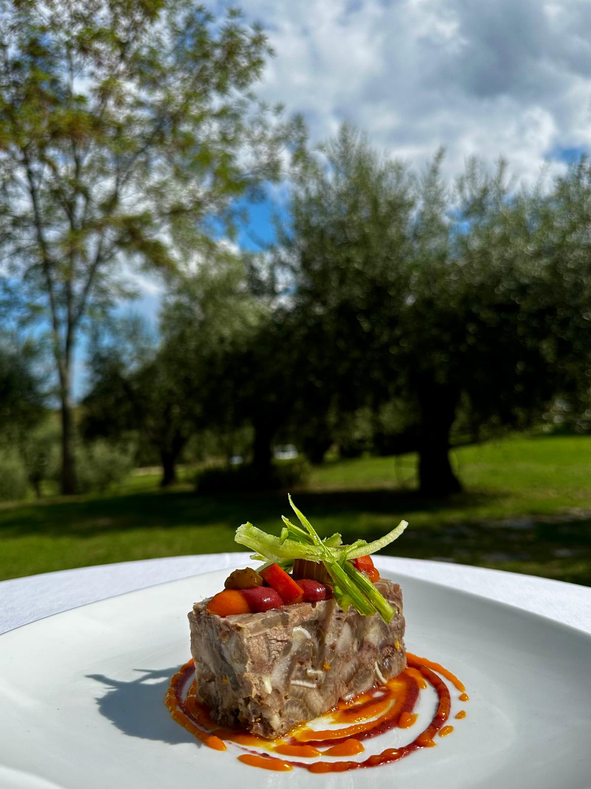 Maiale mantecato, agretti, gel di agrumi e polvere di olive